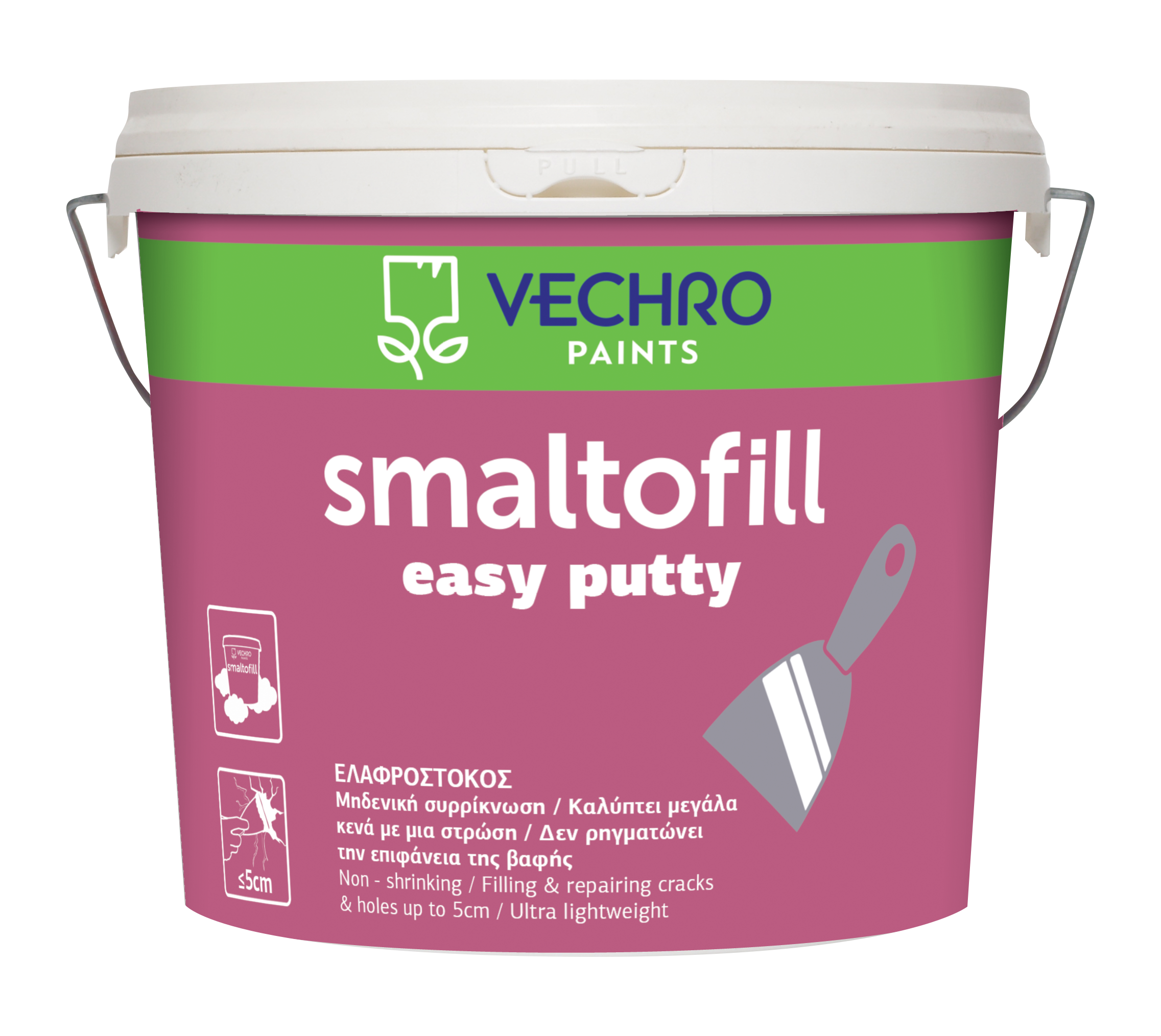 Легкая белая готовая к применению шпатлевка на основе сополимерных акриловых смол. Может использоваться для заполнения швов и ремонта отверстий до 5 см во внутренних поверхностях из гипсокартона, гипса, бетона, кирпича, дерева и т. д. Легко наносится, равномерно распределяется, не стекает и отлично заполняет трещины. Она не дает усадки, быстро сохнет, не трескается, легко натирается, образуя гладкую и прочную поверхность, которую можно перекрасить в любой цвет.
